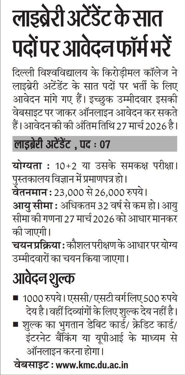 Library Attendant Recruitment 2026 दिल्ली विश्वविद्यालय से संबद्ध किरोड़ी मल कॉलेज ने ‘लाइब्रेरी अटेंडेंट’ के पदों के लिए एक आधिकारिक भर्ती अधिसूचना जारी की है। यह भर्ती अभियान योग्य उम्मीदवारों को एक सरकारी संस्थान में रोज़गार पाने का एक शानदार अवसर प्रदान करता है। इच्छुक और योग्य उम्मीदवार ऑनलाइन आवेदन कर सकते हैं। जिन उम्मीदवारों ने 10+2 परीक्षा उत्तीर्ण की है, वे इस भर्ती के लिए आवेदन करने के पात्र हैं, और चयन प्रक्रिया को अपेक्षाकृत सरल रखा गया है। यह उन उम्मीदवारों के लिए एक सुनहरा अवसर है जो पुस्तकालयों या शैक्षणिक संस्थानों में काम करने की इच्छा रखते हैं।