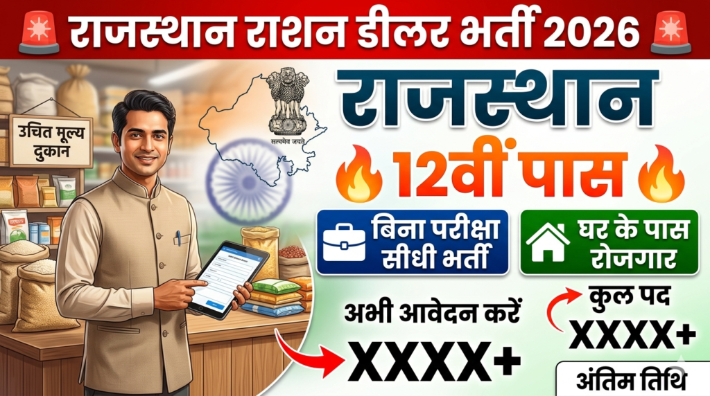 राजस्थान के उन युवाओं के लिए एक बहुत अच्छी खबर आई है जो सरकारी नौकरी की तलाश में हैं। राज्य की राशन वितरण प्रणाली को मज़बूत बनाने के उद्देश्य से, नई ‘राजस्थान राशन डीलर भर्ती 2026’ के लिए एक नोटिफिकेशन जारी किया गया है। इस भर्ती अभियान के ज़रिए, राज्य के अलग-अलग ज़िलों में मौजूद ‘उचित मूल्य की दुकानों’ (Fair Price Shops) के लिए नए राशन डीलरों का चयन किया जाएगा। इस भर्ती की एक खास बात यह है कि इसमें कोई लिखित परीक्षा नहीं होगी; इसके बजाय, उम्मीदवारों का चयन तय नियमों और पात्रता मानदंडों के आधार पर किया जाएगा। अगर आपने 12वीं कक्षा पास कर ली है और अपने गाँव या इलाके में एक सरकारी राशन की दुकान चलाने की इच्छा रखते हैं, तो यह भर्ती आपके लिए एक बेहतरीन मौका साबित हो सकती है। इस लेख में, हम आपको इस भर्ती से जुड़े सभी ज़रूरी पहलुओं—जैसे कि पात्रता मानदंड, आयु सीमा, आवेदन प्रक्रिया, ज़रूरी दस्तावेज़ और चयन प्रक्रिया—के बारे में विस्तार से जानकारी देंगे।