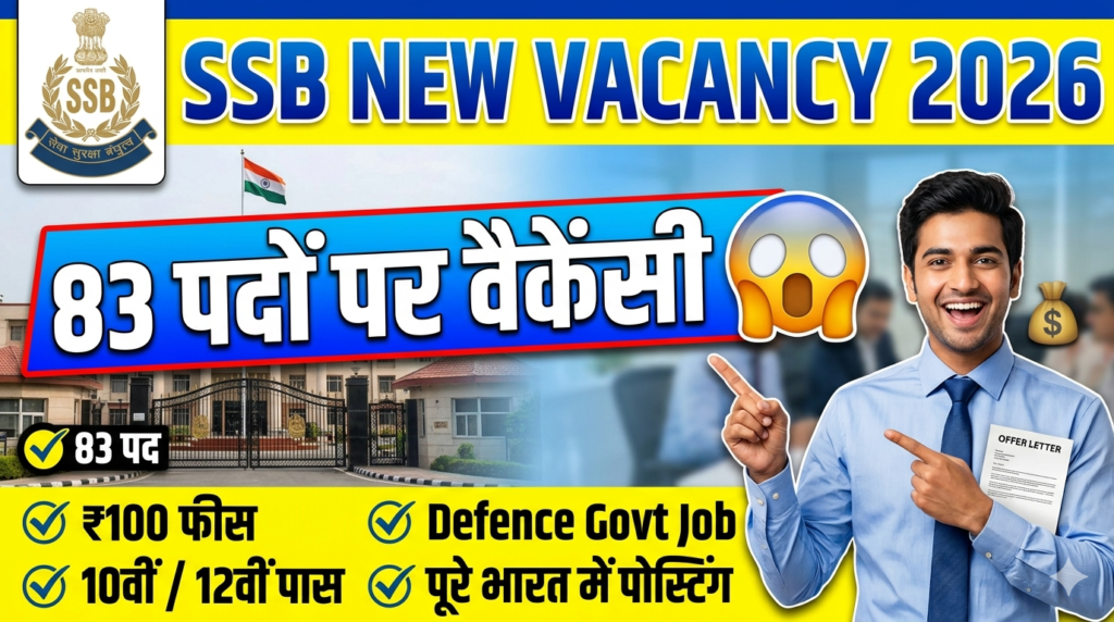 Sashastra Seema Bal Recruitment 2026 अगर आप सरकारी नौकरी की तैयारी कर रहे हैं और देश की सेवा करने की इच्छा रखते हैं, तो आपके लिए एक शानदार मौका आया है। सशस्त्र सीमा बल (SSB) ने विभिन्न पदों के लिए भर्ती का एक आधिकारिक नोटिफिकेशन जारी किया है। इस भर्ती अभियान के तहत, योग्य उम्मीदवारों का चयन कुल 83 रिक्तियों के लिए किया जाएगा। इस भर्ती की एक खास बात यह है कि आवेदन शुल्क मात्र ₹100 रखा गया है, जिससे आर्थिक रूप से कमजोर उम्मीदवारों को सरकारी नौकरी पाने का एक बेहतरीन अवसर मिल रहा है। इच्छुक उम्मीदवार ऑनलाइन आवेदन कर सकते हैं। यह लेख आपको भर्ती से जुड़ी पूरी जानकारी देता है—जिसमें पदों का विवरण, पात्रता मानदंड, आयु सीमा, वेतन, चयन प्रक्रिया, आवेदन की प्रक्रिया, आवश्यक दस्तावेज़ और महत्वपूर्ण तिथियां—विस्तार से शामिल हैं।