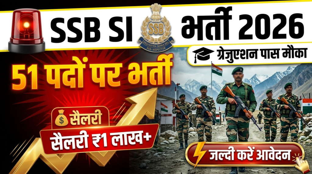 यदि आप सरकारी नौकरी की तैयारी कर रहे हैं और पुलिस या सुरक्षा बलों में अधिकारी बनने की इच्छा रखते हैं, तो आपके लिए एक सुनहरा अवसर आया है। सशस्त्र सीमा बल (SSB) ने सब-इंस्पेक्टर (SI) के 51 पदों के लिए भर्ती अधिसूचना जारी की है। इस भर्ती के लिए चुने गए उम्मीदवारों को लेवल-7 के अनुसार बेहतरीन वेतन, भत्ते और सरकारी सुविधाएं दी जाएंगी, जिससे उनकी कुल मासिक कमाई ₹1 लाख से भी अधिक हो सकती है।