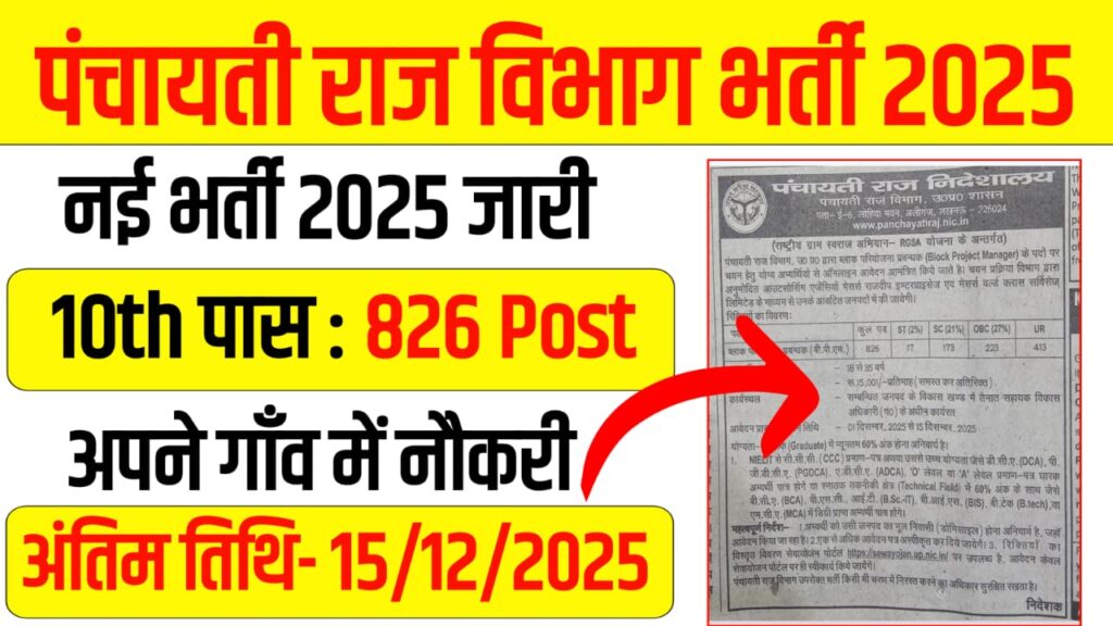 UP Panchayati Raj BPM Recruitment 2025 The notification for the UP Panchayati Raj Department Recruitment 2025 has been released through the official website. According to the released notification, you can apply for 826 posts within this vacancy. Online applications for this vacancy can be made from December 1, 2025, to December 15, 2025. If you wish to apply for this vacancy, please check the official notification once.
