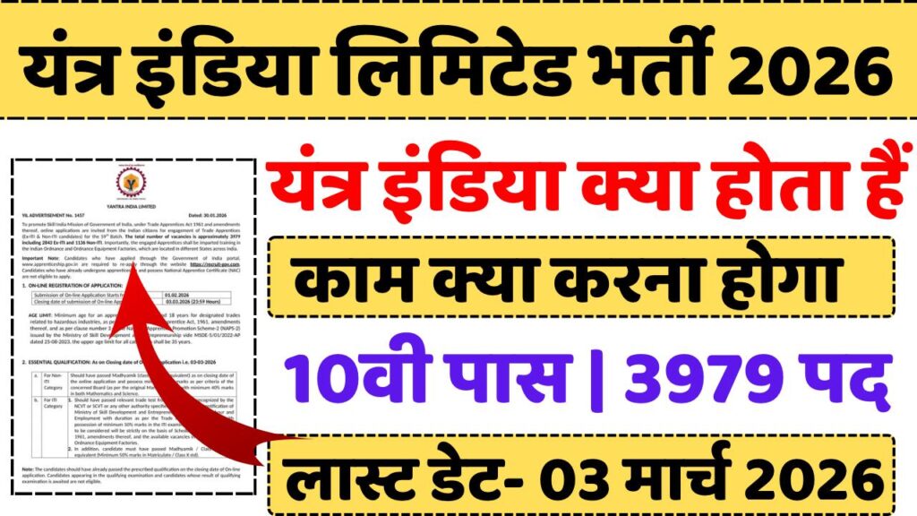 Yantra India Limited has released a recruitment notification for 3979 posts. The application forms will be available from February 1, 2026 to March 3, 2026. Both male and female candidates from all over India can apply. For more information, please refer to the official notification.